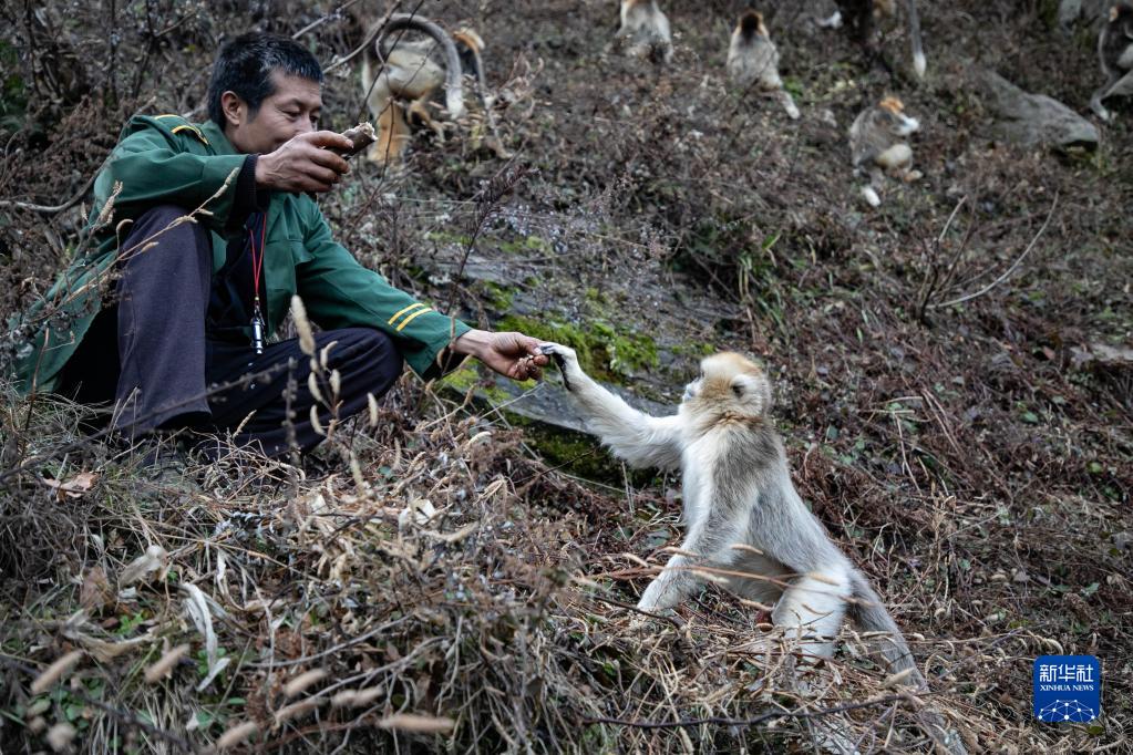 楊忠錄與大熊貓國家公園甘肅省片區(qū)裕河園區(qū)內的川金絲猴互動(1月4日攝)。