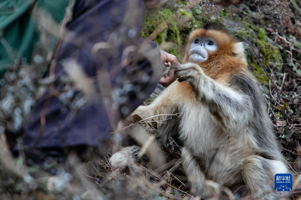 楊忠錄與大熊貓國家公園甘肅省片區(qū)裕河園區(qū)內(nèi)的川金絲猴互動(1月4日攝)。