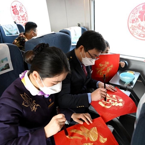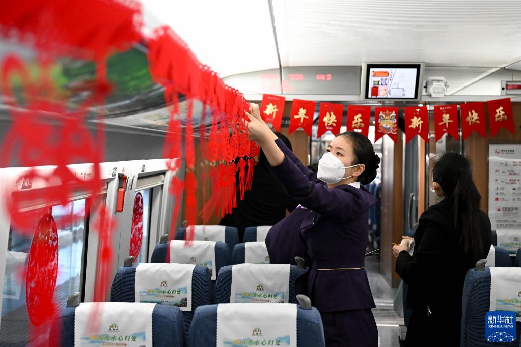 當日,中國鐵路上海局集團有限公司合肥客運段組織工作人員,將G8341次列車裝扮一新,在列車上舉辦“情暖回家路”主題活動。猜謎語、演唱黃梅戲、手寫福字送祝福,讓乘客在旅途中感受節日氛圍。