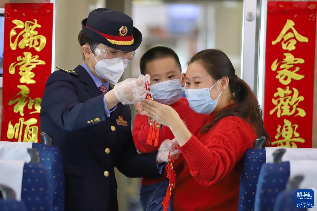 當(dāng)日,中國(guó)鐵路南昌局集團(tuán)有限公司南昌客運(yùn)段的工作人員在G5305次列車(chē)與旅客一起掛中國(guó)結(jié)、貼春聯(lián),營(yíng)造喜慶氣氛。