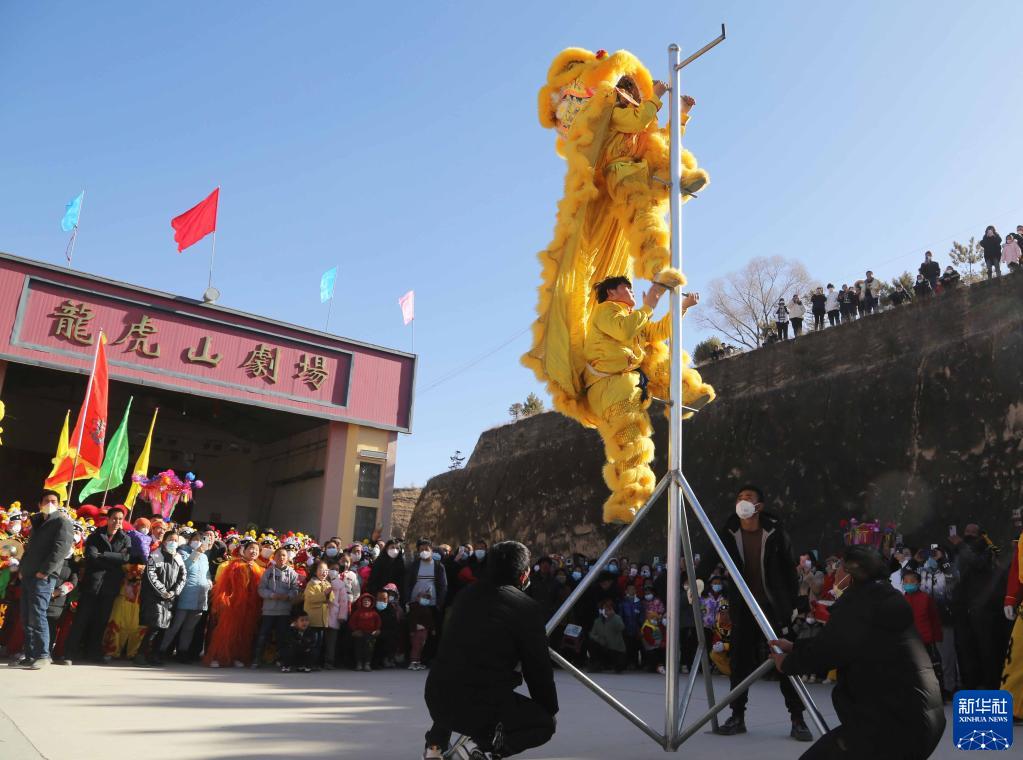 1月6日,甘肅省定西市安定區內官營鎮萬崖村社火隊演練傳統社火節目舞獅。