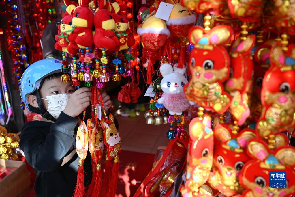 1月6日,一名小朋友在海南省??谑胁勐纺曦浭袌鎏暨x兔年飾品。