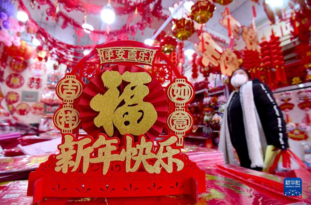 1月6日,市民在河北省邯鄲市一處年貨市場選購春節飾品。