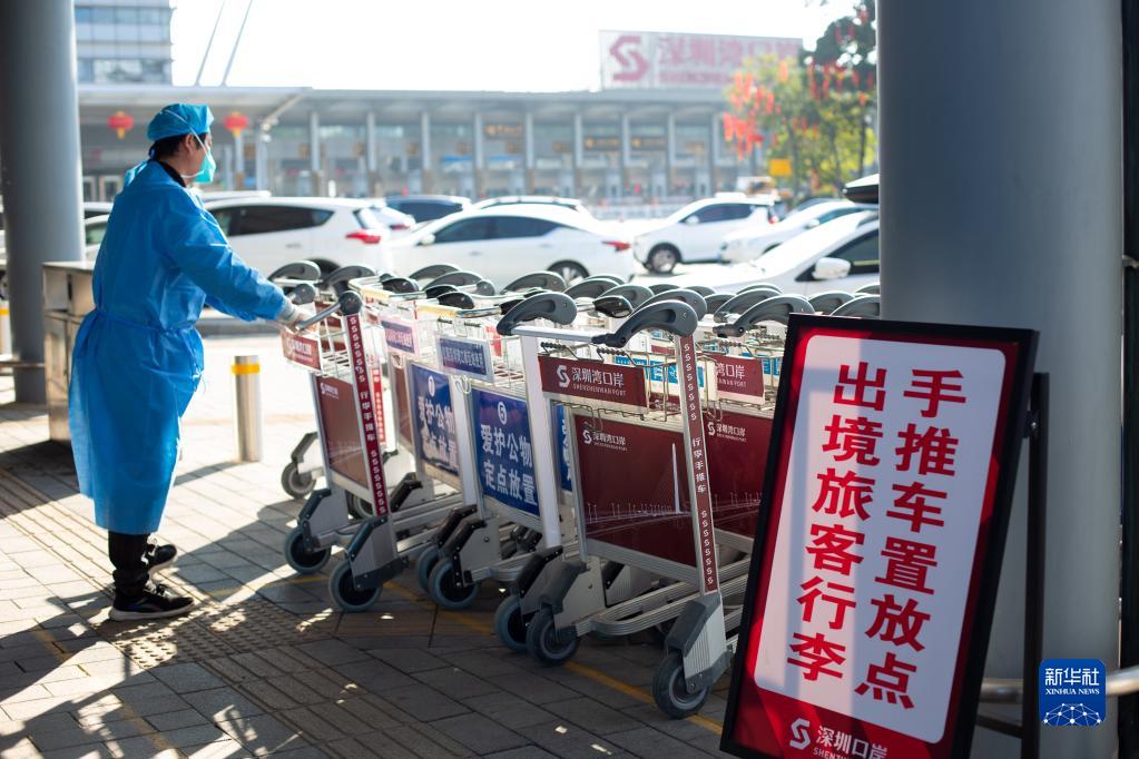 1月6日,在深圳灣口岸,工作人員在整理行李手推車。