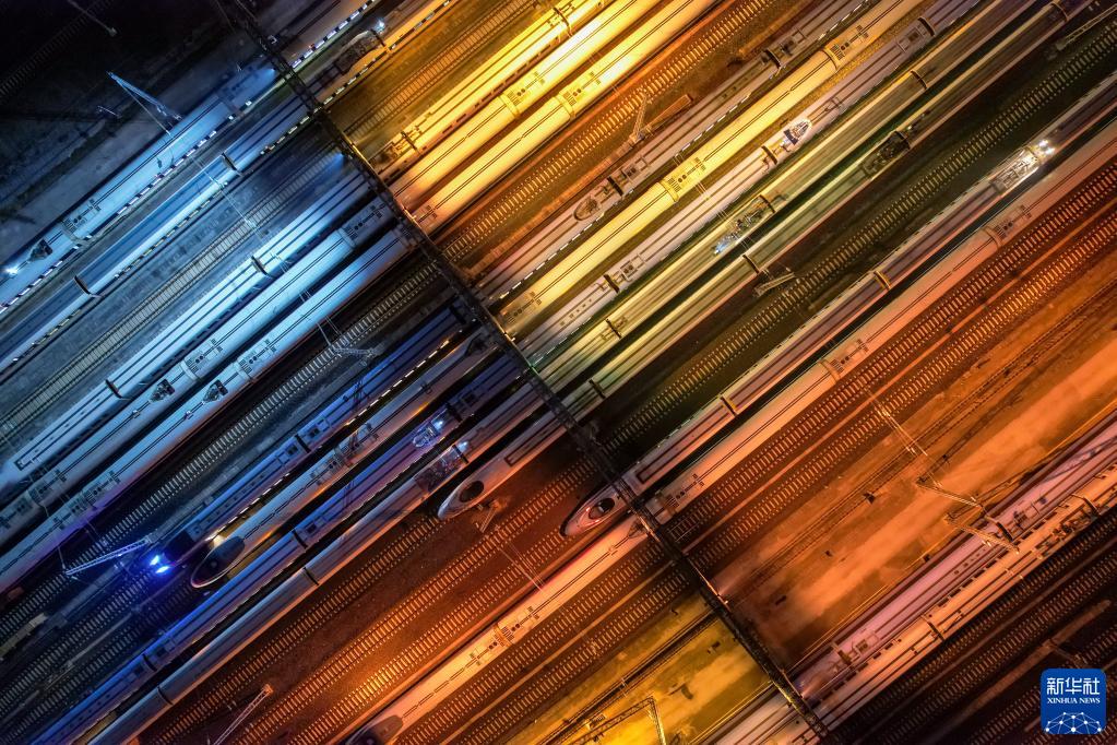 1月7日,2023年春運啟動。1月6日晚,在中國鐵路成都局集團有限公司貴陽北動車所,停靠在存車線上的動車排列整齊如同一支“陸地艦隊”。
