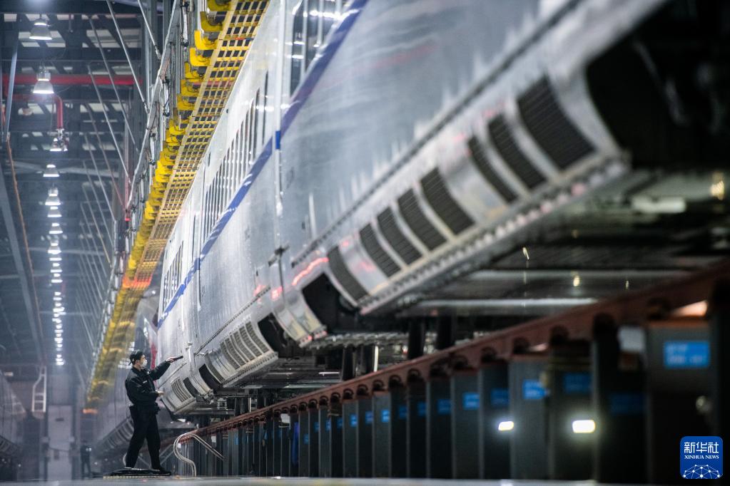 1月6日,地勤機械師在檢查動車組車體外觀狀態。