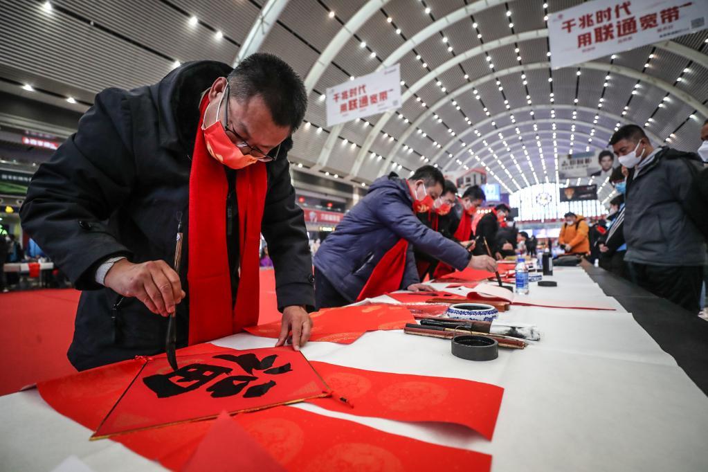 1月7日,書法家在沈陽站內(nèi)為旅客書寫福字、對聯(lián)。
