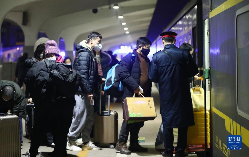 1月7日凌晨,在山東省滕州市火車站,旅客在站臺乘車。