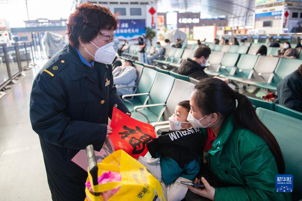 1月7日,在長沙南站候車室,工作人員給旅客送“福”字。