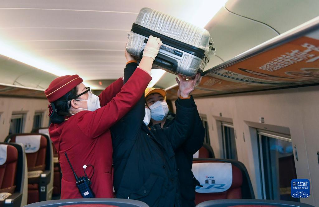 1月7日,在北京西站,列車乘務(wù)員在發(fā)車前幫旅客放置行李。