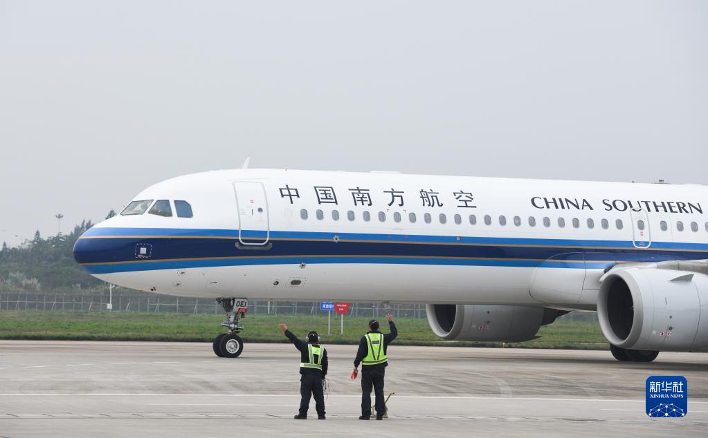 1月7日,在海口美蘭國際機場,工作人員揮手送別即將起飛的飛機。