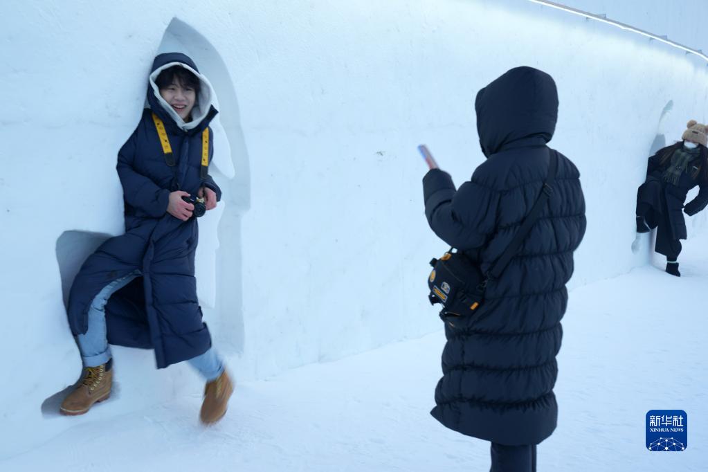 1月6日,游客在哈爾濱冰雪大世界園區的雪墻前拍照。