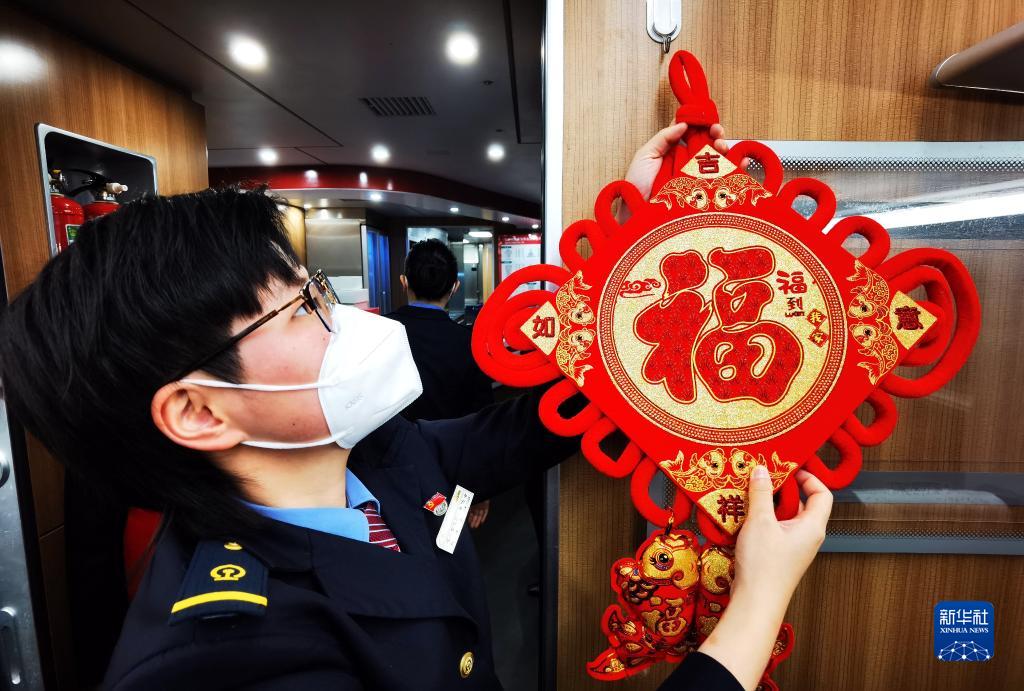 1月7日,乘務(wù)員在北京豐臺開往福州的D759次列車車廂里掛“福”字。