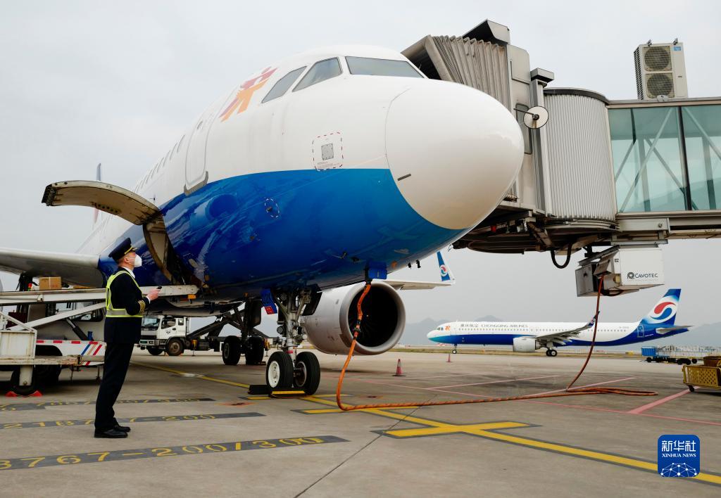 1月6日,重慶江北國際機場的停機坪上,機長菅士博對客機進行起飛前的繞機檢查。