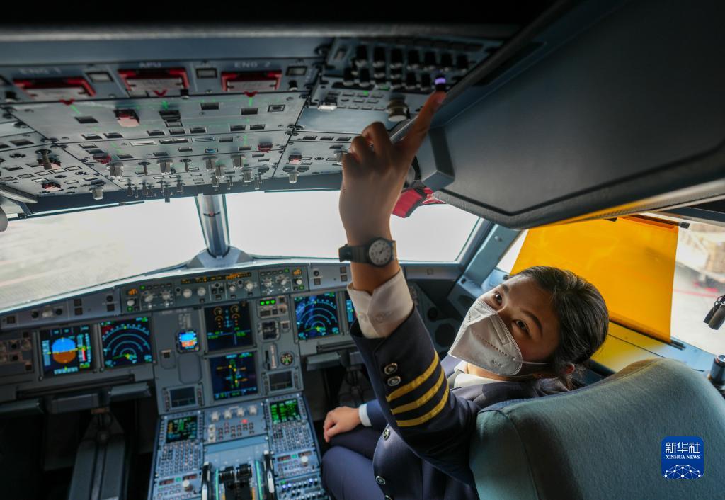 1月6日,重慶航空客機駕駛艙內,擔任副駕駛的楊靜協助她所在航班機長進行駕駛艙內的起飛前準備工作。