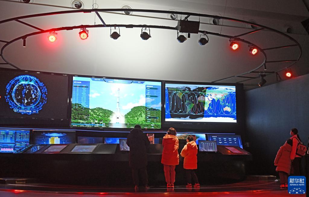 1月7日,觀眾在國家海洋博物館參觀“探索·星辰大海──航天科技主題成果巡回展”時了解模擬火箭發射。