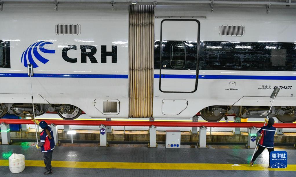 2023年春運于1月7日啟動。中國鐵路成都局集團有限公司貴陽車輛段貴陽北動車運用所的工作人員對動車組列車進行檢修、保養、清潔,確保春運期間列車運行安全和旅客乘車環境舒適。