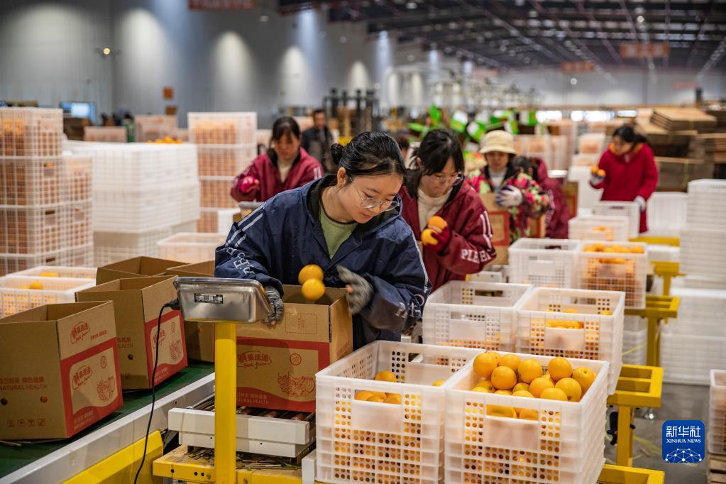1月6日,在中國三峽柑橘(奉節臍橙)交易中心,工作人員對即將發貨的臍橙裝箱稱重。