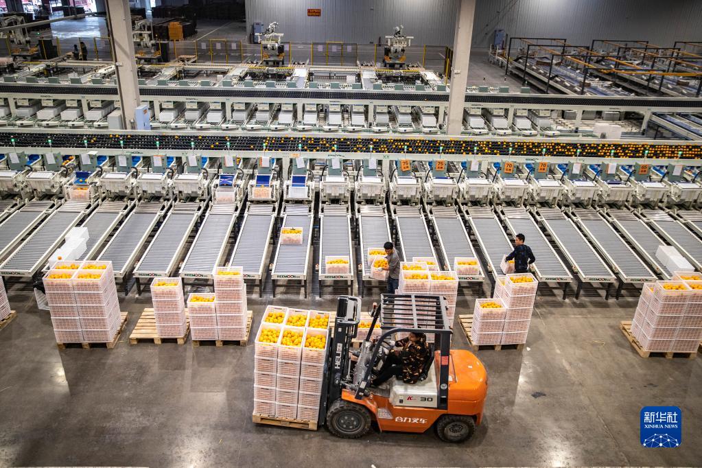 1月6日,工作人員在中國三峽柑橘(奉節臍橙)交易中心搬運經全自動分揀線分選的臍橙。