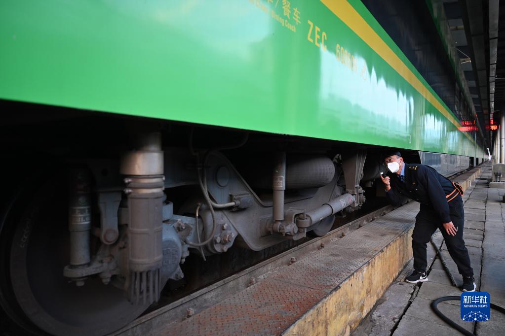 1月7日,在中國鐵路南昌局集團有限公司福州車輛段,工作人員在檢查“綠巨人”列車的車輪部件。