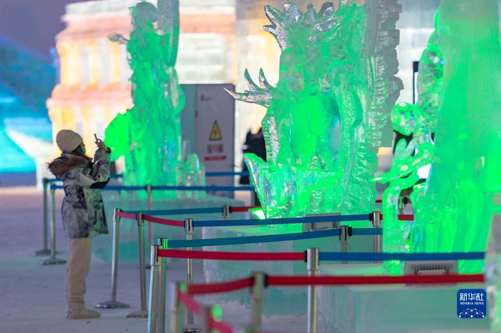 1月5日,游客在哈爾濱冰雪大世界園區欣賞冰雕作品。