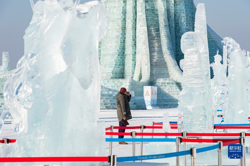 1月5日,在哈爾濱冰雪大世界園區(qū),評委觀看參賽冰雕作品。