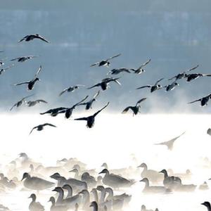 近日,在遼寧省沈陽市渾河上,萬余只鴻雁、赤麻鴨、鴛鴦等候鳥遷徙來此棲息。它們成群結隊在河面上嬉戲、休憩,成為冬日里一道美麗的風景線。