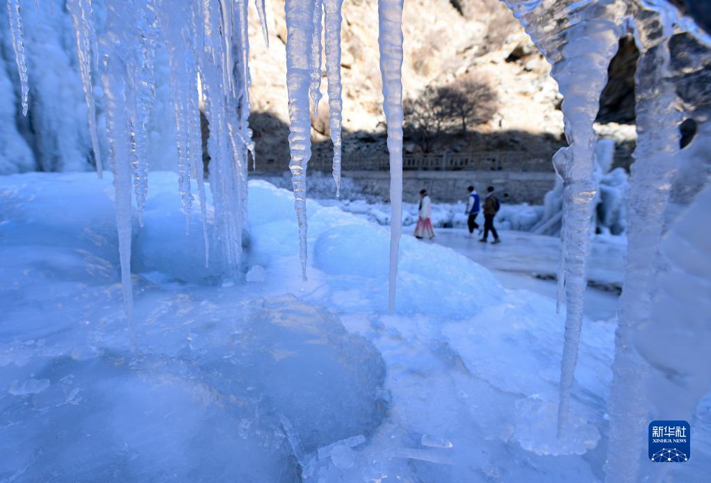 1月7日,游客在寧夏銀川市賀蘭山巖畫景區(qū)觀賞冰瀑景觀。