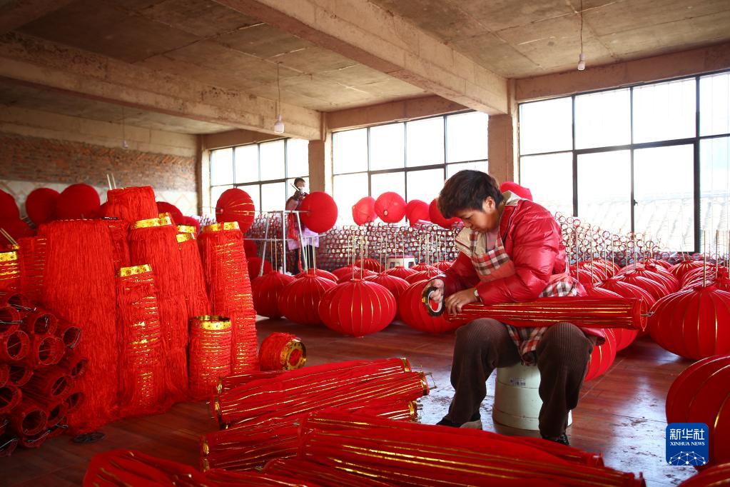 1月8日,工人在云南省曲靖市麒麟區益寧街道的一家燈籠作坊制作紅燈籠。