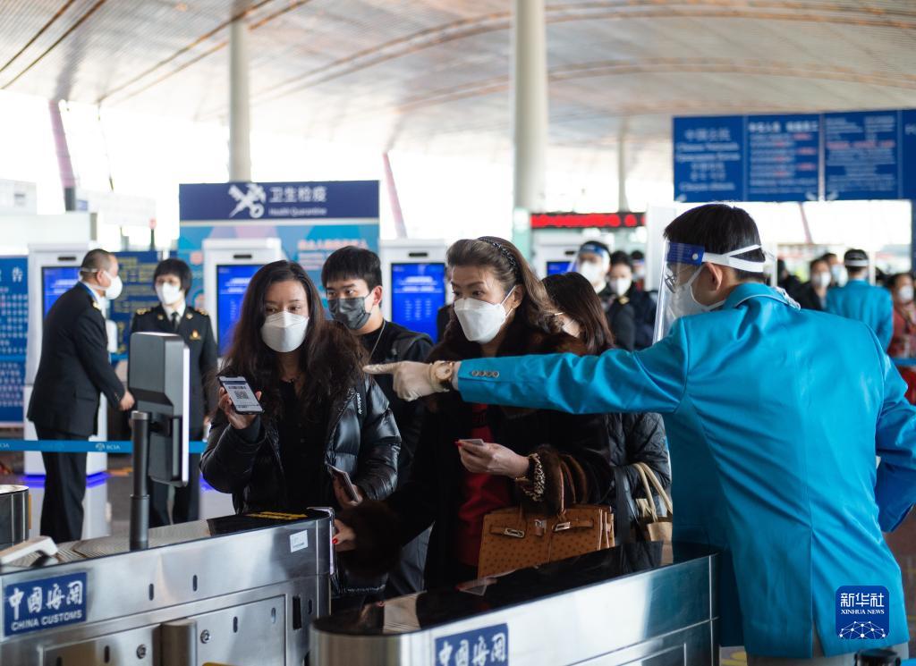 1月8日,首都國(guó)際機(jī)場(chǎng)工作人員引導(dǎo)入境旅客掃“旅客健康申報(bào)二維碼”后通過(guò)海關(guān)閘機(jī)。