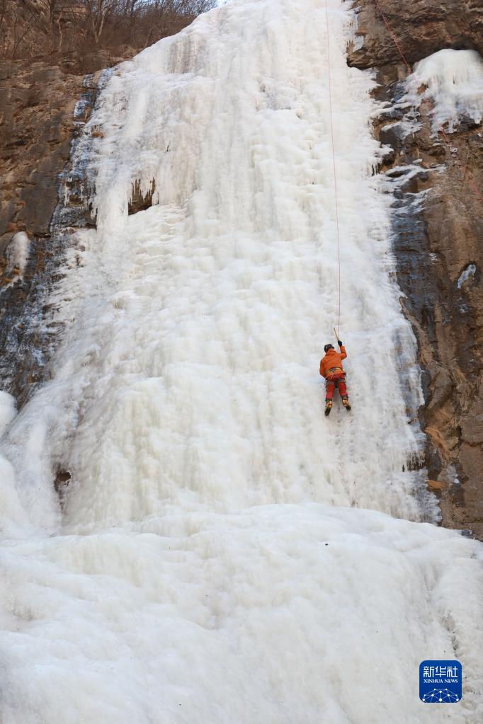 近日,河北邢臺市云夢山景區內的七疊瀑形成壯觀冰壁,吸引不少游客前來游玩。攀冰愛好者借助專業工具,在專職教練的指導下體驗攀冰,成為太行山冬日里一道別樣風景。