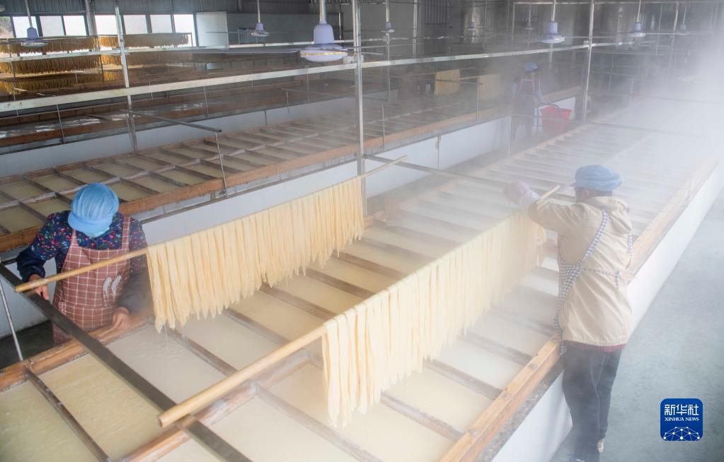 春節(jié)臨近,湖南省永州市江華瑤族自治縣涔天河鎮(zhèn)的腐竹加工廠忙著生產(chǎn)手工腐竹,供應節(jié)日市場。