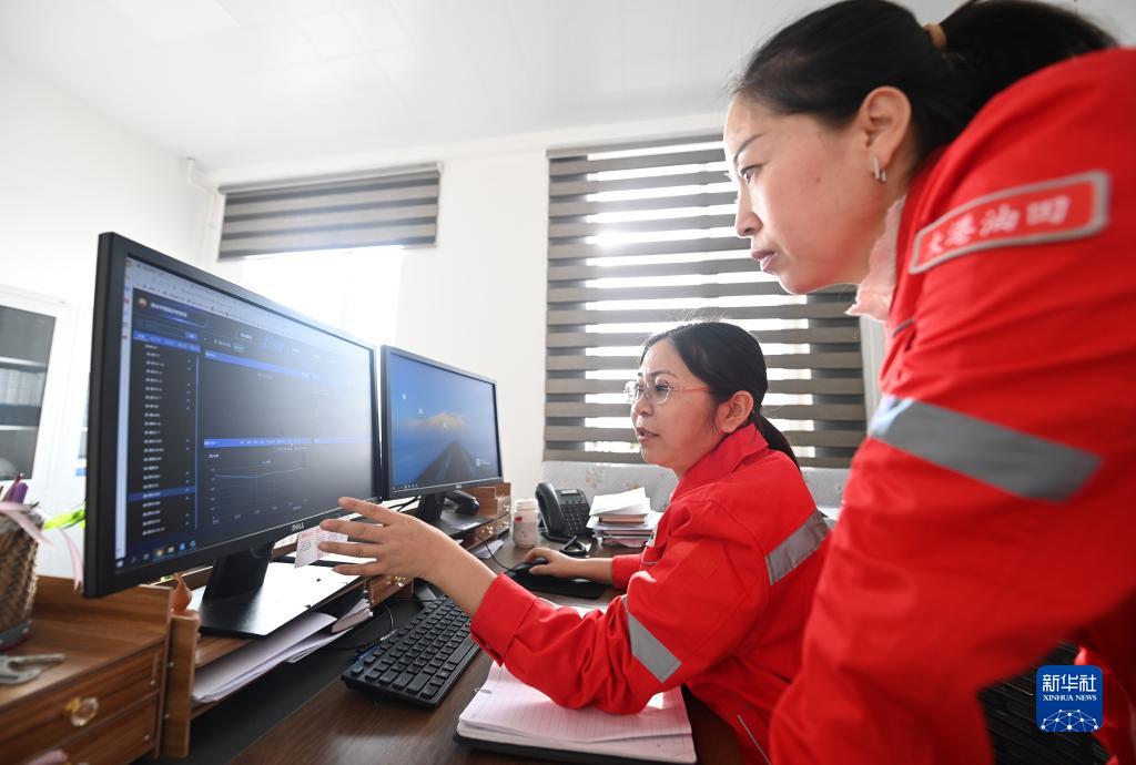 尤立紅(左)和同事分析油井生產數據(1月6日攝)。