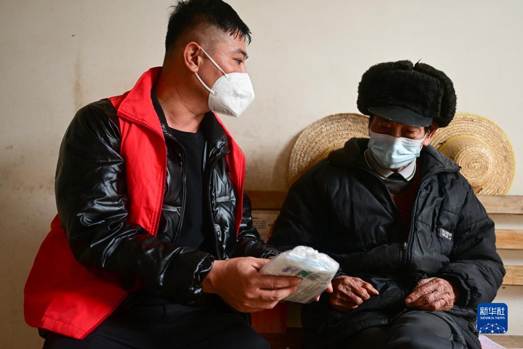 1月7日,在海南省文昌市鋪前鎮(zhèn)地太村,村干部向高齡老人發(fā)放防疫“健康包”,并介紹防疫物品使用方法。