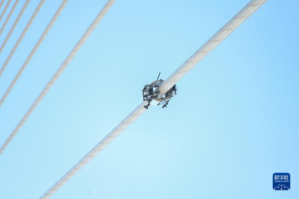 1月8日,橋梁纜索智能檢測機器人對福建平潭公鐵兩用跨海大橋的斜拉索進行檢測。