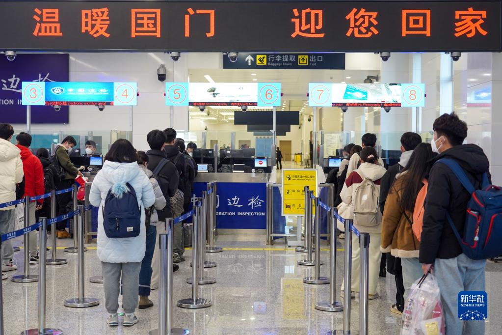 1月9日,入境旅客在濟南出入境邊防檢查站排隊辦理入境手續。