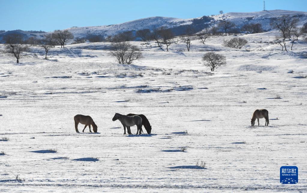 寒冬時節,內蒙古錫林郭勒盟西烏珠穆沁旗的草原銀裝素裹,樹木點綴其間,動物悠閑覓食,一派美麗的冬日景象。