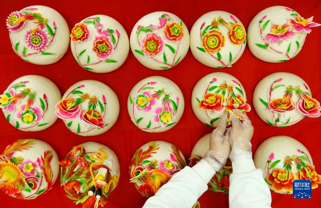春節臨近,山東省青島市即墨區的農民趕制花饃等傳統面食,供應節日市場。即墨當地有過年做花饃的習俗,寓意新的一年日子紅紅火火,生活蒸蒸日上。
