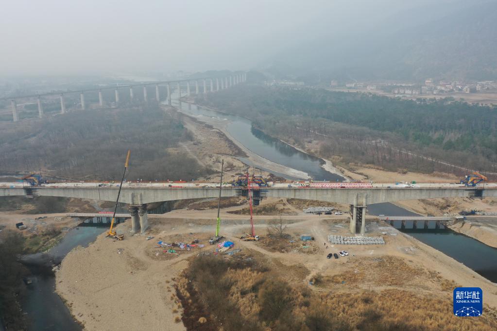 1月10日拍攝的杭溫鐵路仙居特大橋五連跨剛構連續梁(無人機照片)。該連續梁同時上跨既有公路線、縣道和溪流。