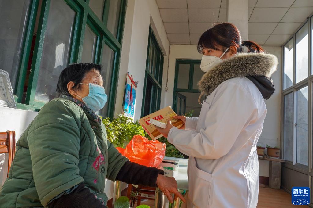 1月10日,山東省濟南市長清區(qū)大崮山村衛(wèi)生室全科醫(yī)生王玉新上門為76歲的王好美老人發(fā)放藥品。