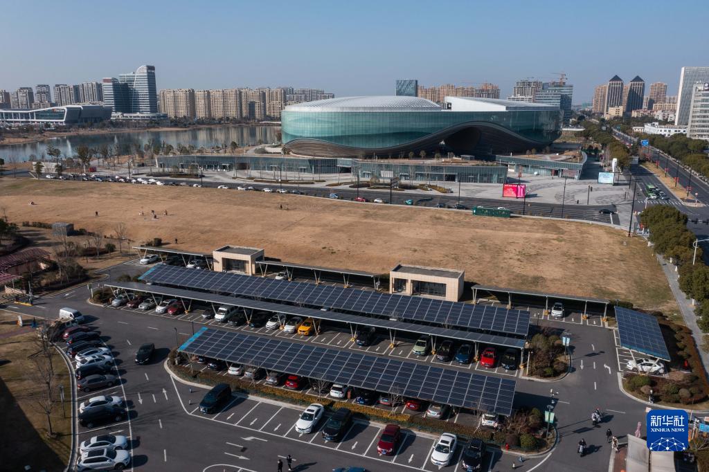 這是嘉興市秀洲區秀湖公園的“光伏車棚”,這里的光伏車棚總裝機量達466千瓦,年發電量約45萬度(1月10日攝,無人機照片)。