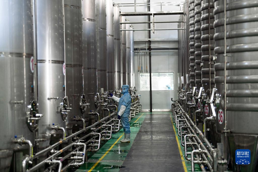 1月10日,在圍場縣一家沙棘深加工企業(yè)的沙棘冰酒釀造車間,工人檢查罐內(nèi)儲酒。