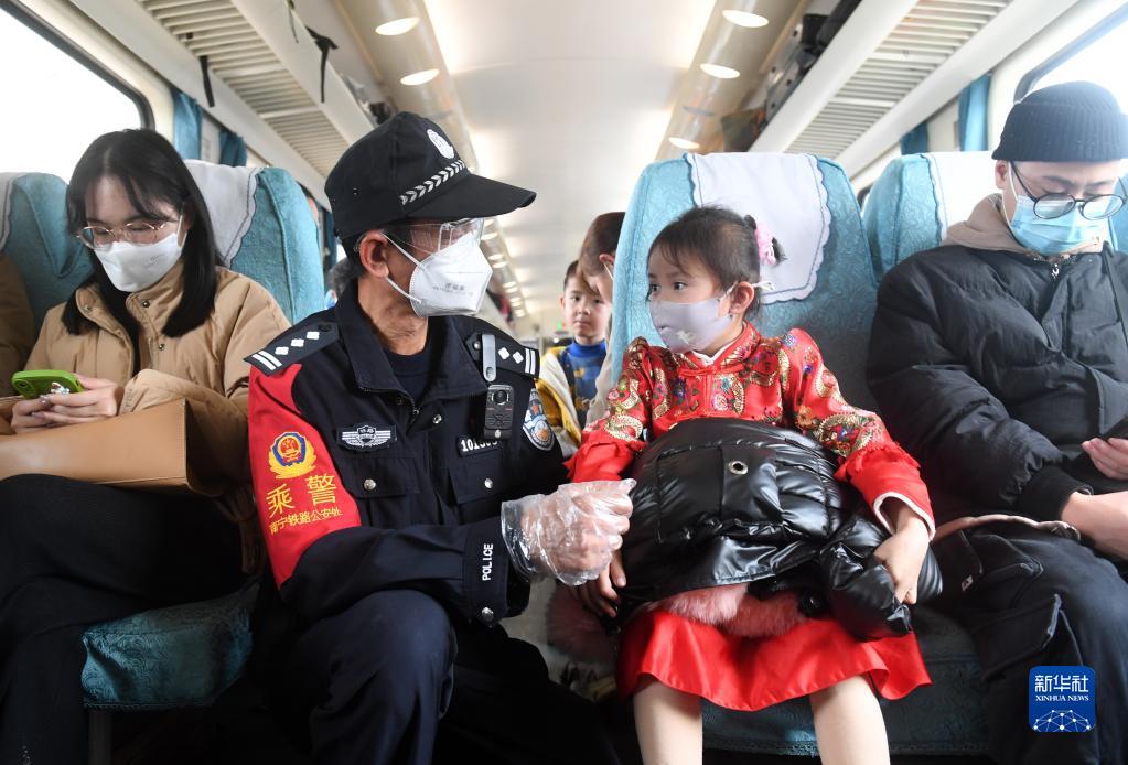 1月10日,覃業(yè)民在列車上和一名小朋友交流。