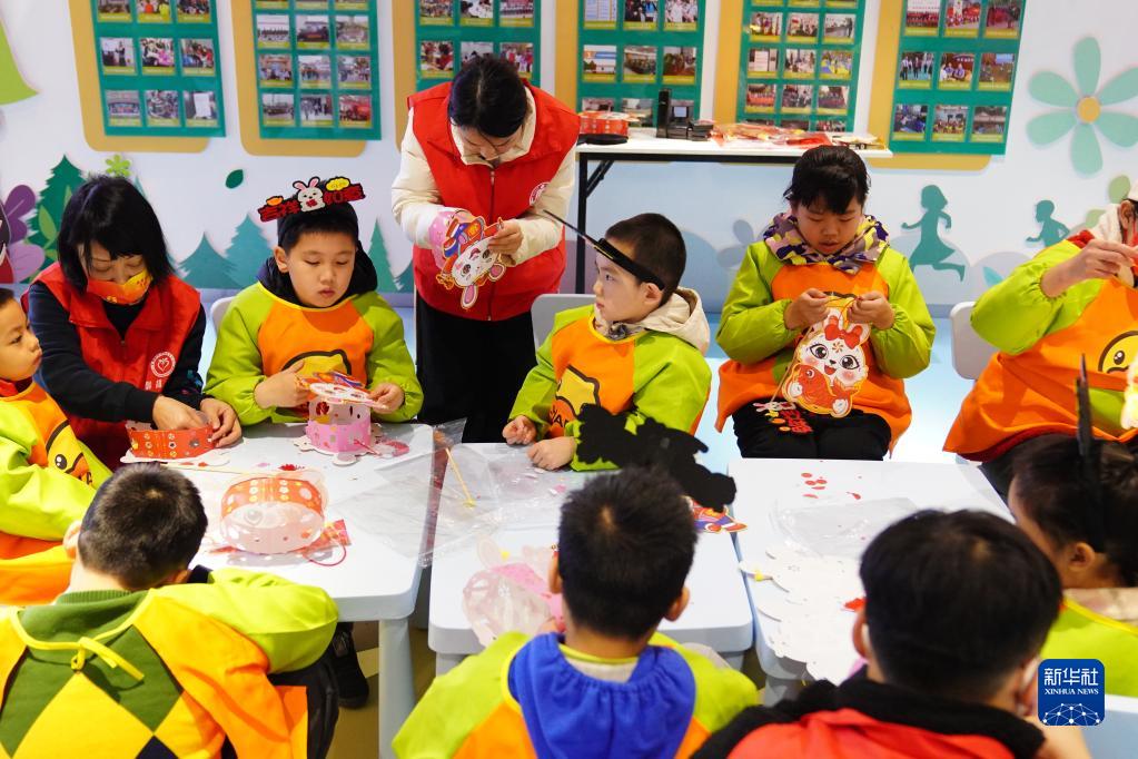 1月10日,在重慶市北碚區(qū)未成年人保護(hù)中心,社工在指導(dǎo)孩子們組裝玉兔造型的手工燈籠。