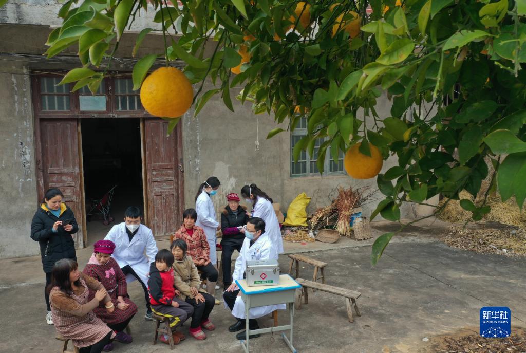 1月10日,在郴州市安仁縣渡口鄉(xiāng)長(zhǎng)灘村,來自南華大學(xué)第一臨床學(xué)院的志愿者給當(dāng)?shù)卮迕窳x診(無人機(jī)照片)。