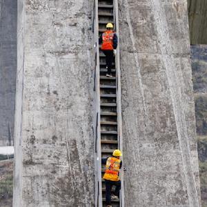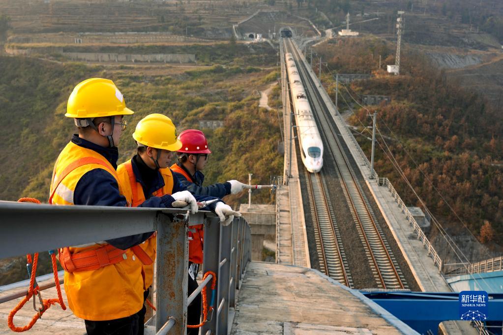 成貴高鐵鴨池河特大橋橫跨貴州省黔西市境內的鴨池河,在地勢險峻的峽谷間,每天約有100多組春運動車穿行經過。在最高處距離河面約277米的大橋上,鐵路職工堅守崗位,嚴格巡檢,對大橋的鋼結構、供電設備、橋梁支座、外包混凝土等進行細致檢查,根據列車運行情況調整軌道線路的幾何尺寸、進行鋼軌探傷等作業,全力保障春運期間動車組安全通過。