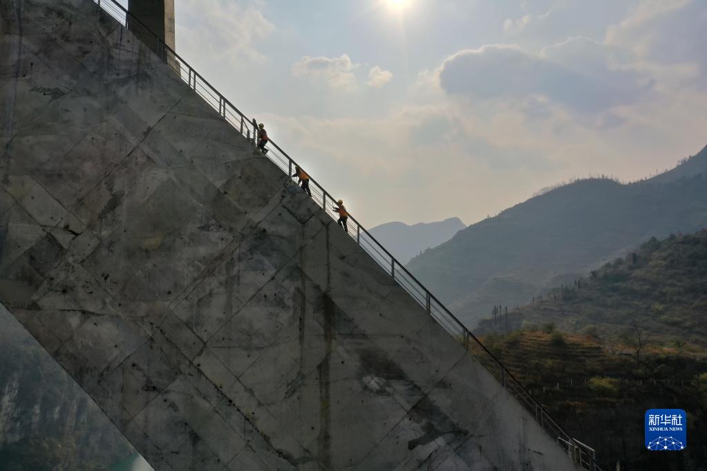 1月10日,貴陽高鐵工務段工作人員在大橋上攀爬(無人機照片)。