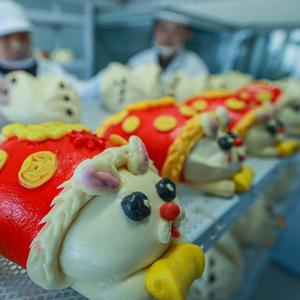 1月11日,在榮成市崖頭街道榮安社區一處花餑餑制作坊,工作人員在擺放蒸制好的“兔頭”花餑餑和棗餑餑。