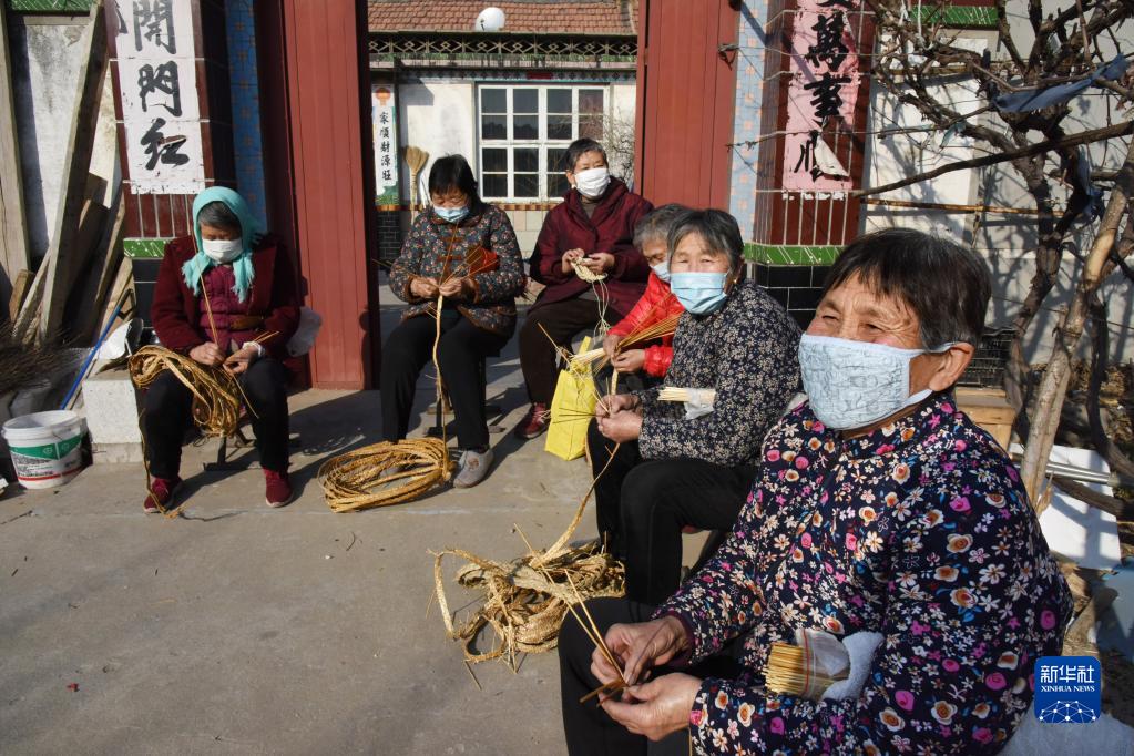 1月10日,平度市新河鎮龍灣姜家村村民李希英(右一)和老人們一起在家門口編織。