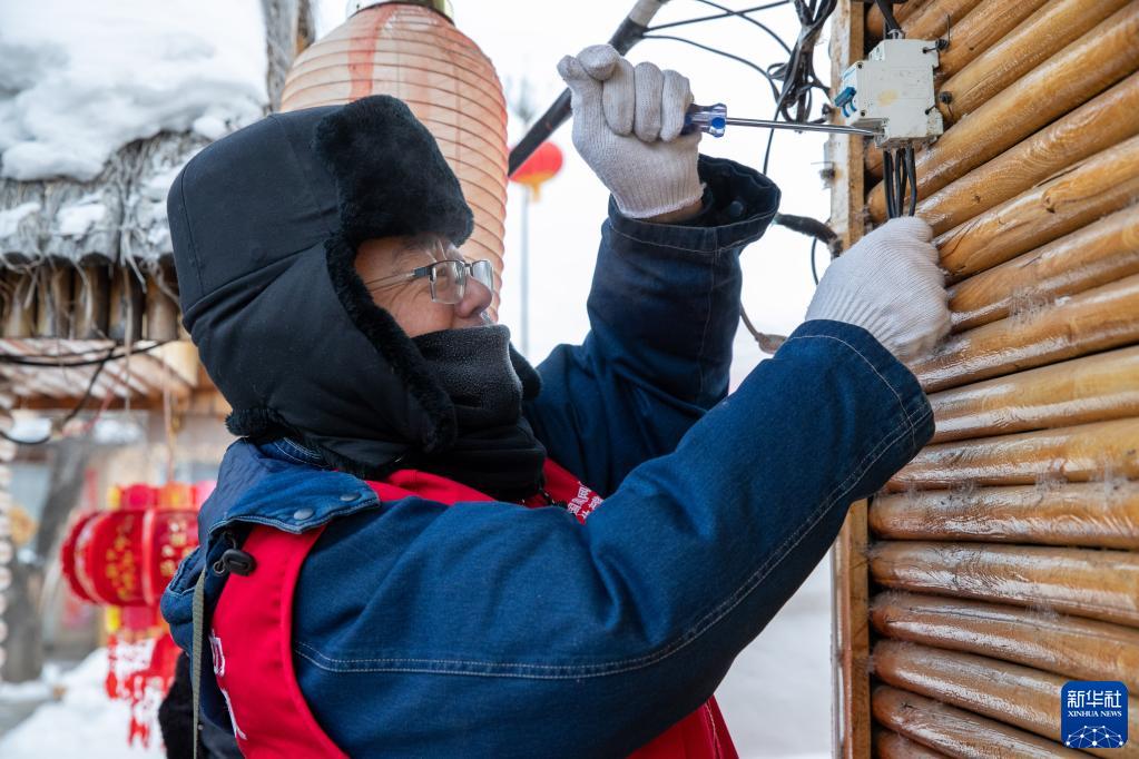 1月9日,在漠河市北極村,線路設備運維人員代洪濱在幫助一家民宿維修設備。新華社記者 張濤 攝